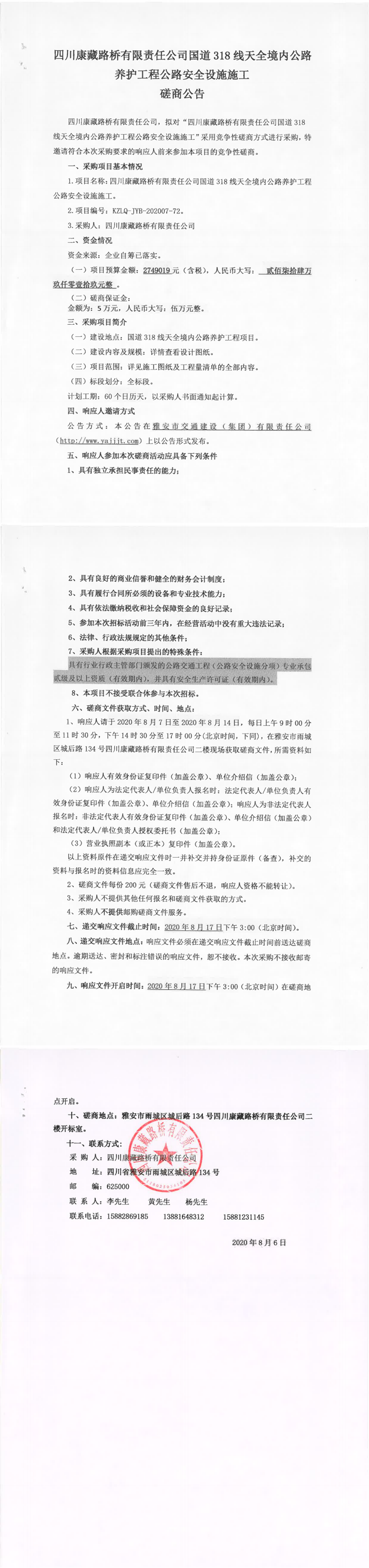 四川康藏路橋有限責(zé)任公司國道318線天全境內(nèi)公路養(yǎng)護工程公路安全設(shè)施施工磋商公告