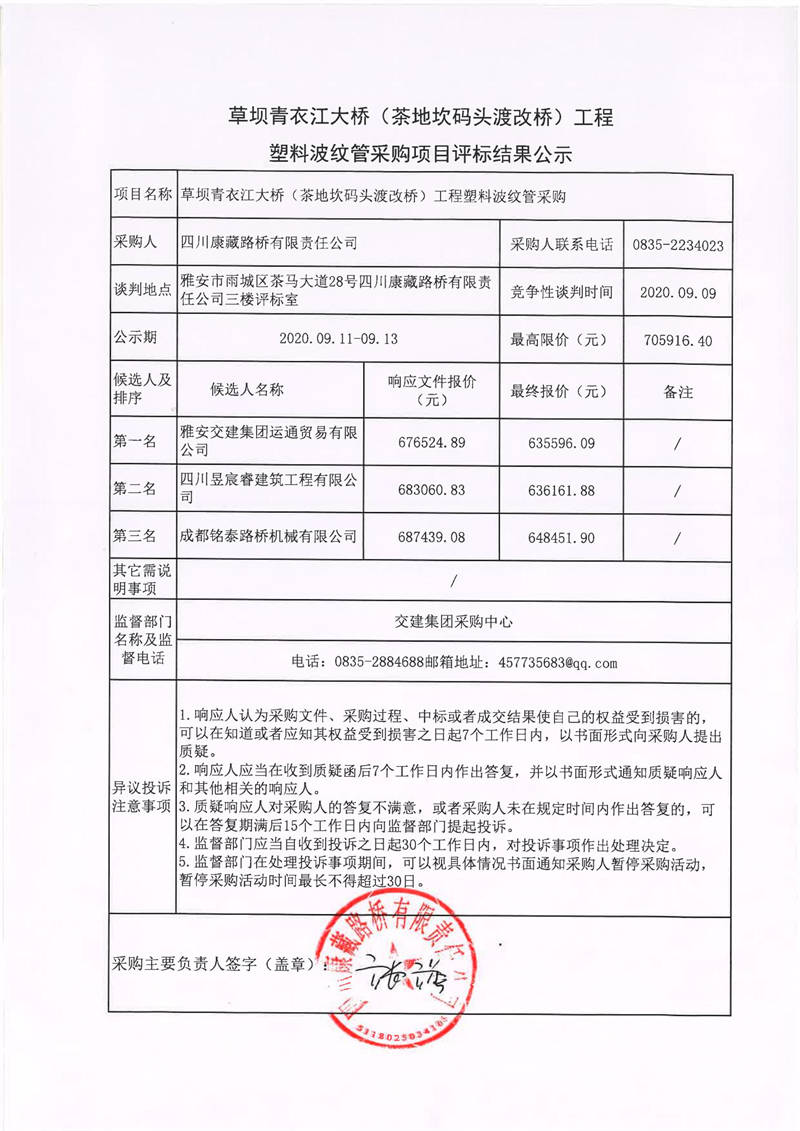 四川康藏路橋有限責任公司草壩青衣江大橋(茶地坎碼頭渡改橋)工程塑料波紋管采購項目評標結(jié)果公示