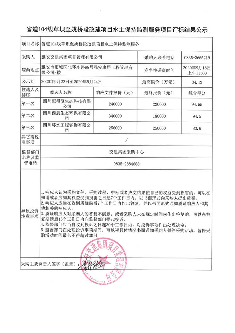 雅安交建集團(tuán)項(xiàng)目管理有限公司省道104線(xiàn)草壩至姚橋段改建項(xiàng)目水土保持監(jiān)測(cè)服務(wù)項(xiàng)目評(píng)標(biāo)結(jié)果公示