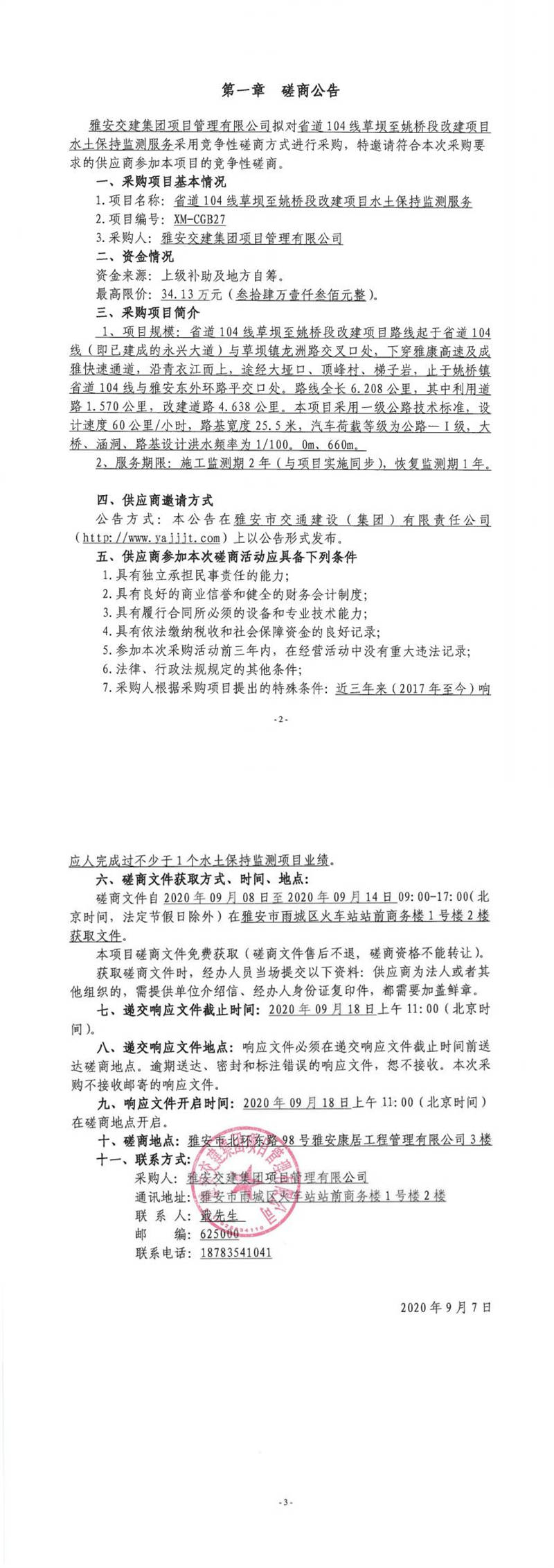 雅安交建集團(tuán)項目管理有限公司省道104線草壩至姚橋段改建項目水土保持監(jiān)測服務(wù)競爭性磋商公告