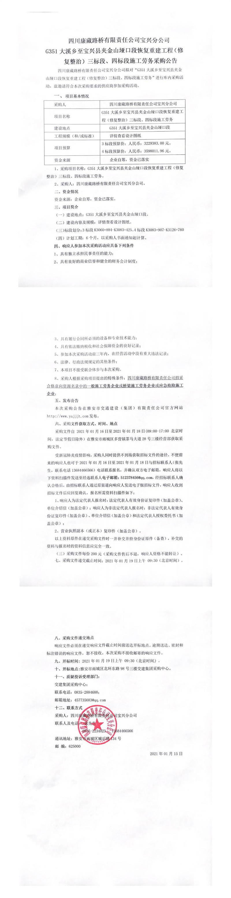 四川康藏路橋有限責(zé)任公司寶興分公司G351線(xiàn)寶興縣大溪鄉(xiāng)至寶興縣夾金山埡口段恢復(fù)重建工程(修復(fù)整治)三標(biāo)段、四標(biāo)段施工勞務(wù)采購(gòu)公告