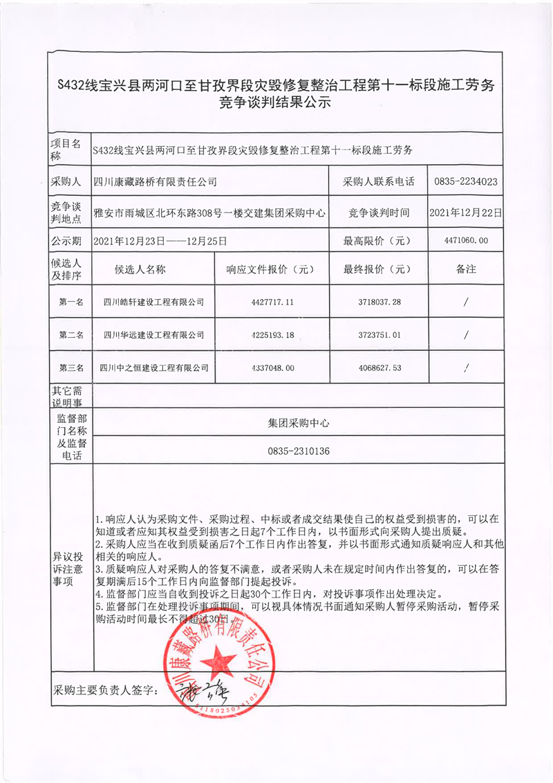 四川康藏路橋有限責(zé)任公司S432線寶興縣兩河口至甘孜界段災(zāi)毀修復(fù)整治工程第十一標(biāo)段施工勞務(wù)競爭談判結(jié)果公示