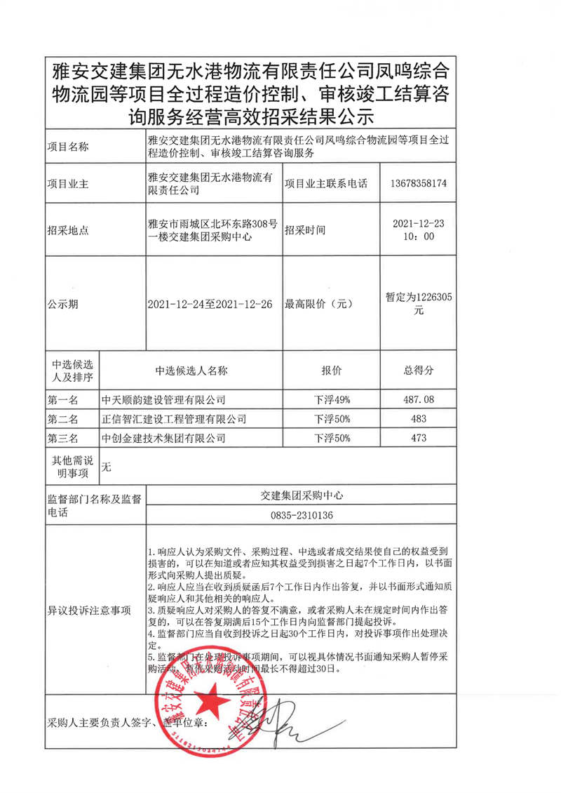 雅安交建集團(tuán)無水港物流有限責(zé)任公司鳳鳴綜合物流等項目全過程造價控制、審核竣工結(jié)算咨詢服務(wù)經(jīng)營高效招采結(jié)果公示