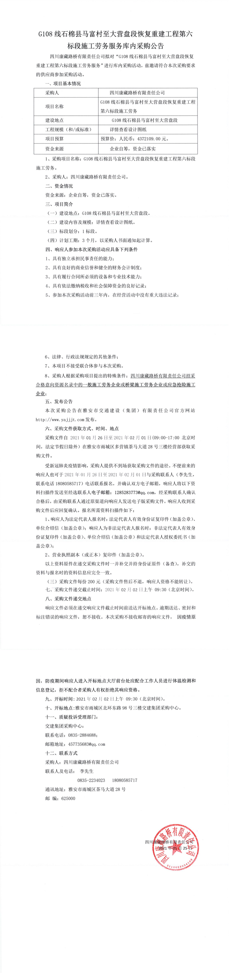 四川康藏路橋有限公司G108線石棉縣馬富村至大營盤段恢復重建工程第六標段施工勞務服務庫內采購公告