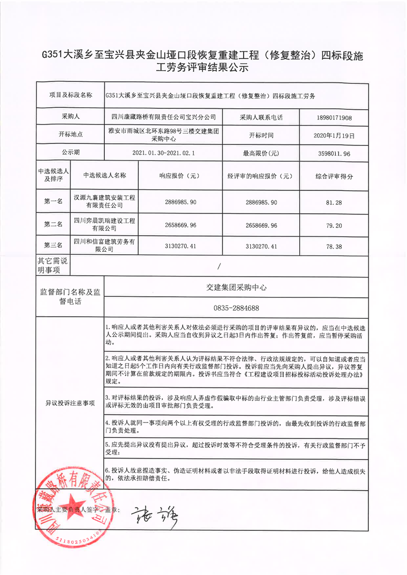 四川康藏路橋有限責(zé)任公司G351大溪鄉(xiāng)至寶興縣夾金山埡口段恢復(fù)重建工程(修復(fù)整治)四標(biāo)段施工勞務(wù)評審結(jié)果公示