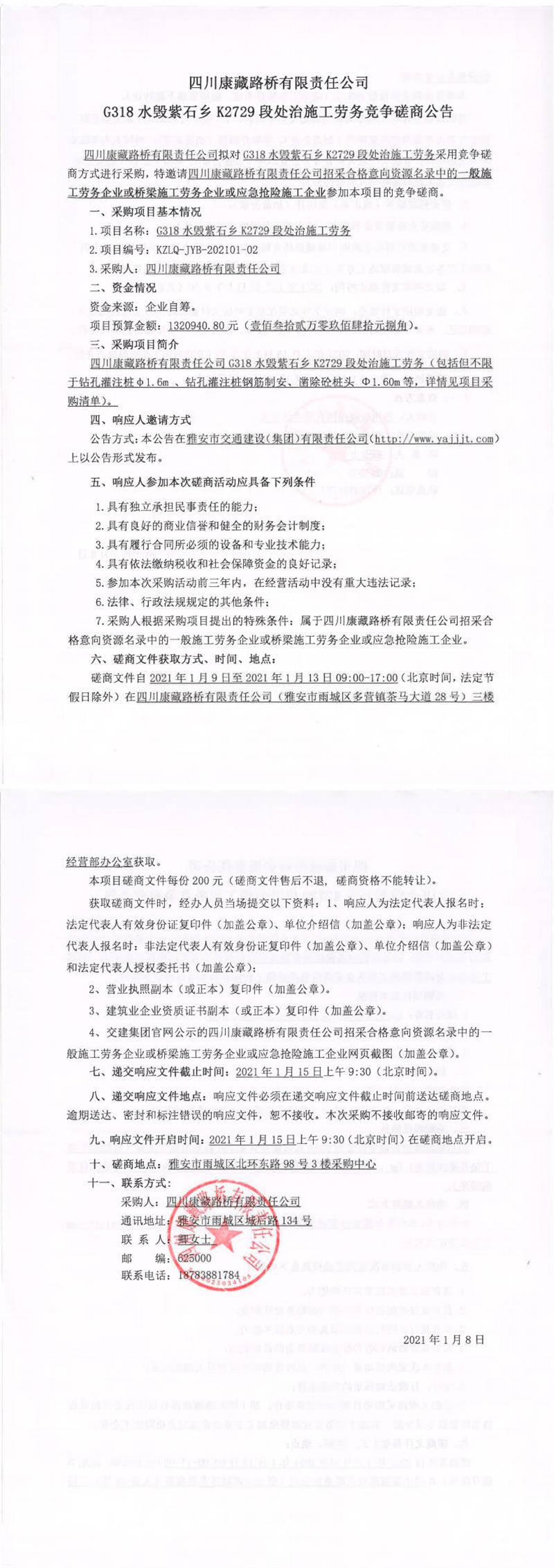四川康藏路橋有限責(zé)任公司G318水毀紫石鄉(xiāng)K2729段處治施工勞務(wù)競爭磋商公告