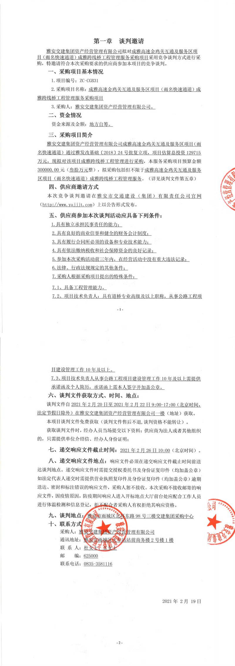 雅安交建集團資產(chǎn)經(jīng)營管理有限公司成雅高速金雞關(guān)互通及服務(wù)區(qū)項目(雨名快速通道)成雅跨線橋工程管理服務(wù)采購項目競爭談判公告
