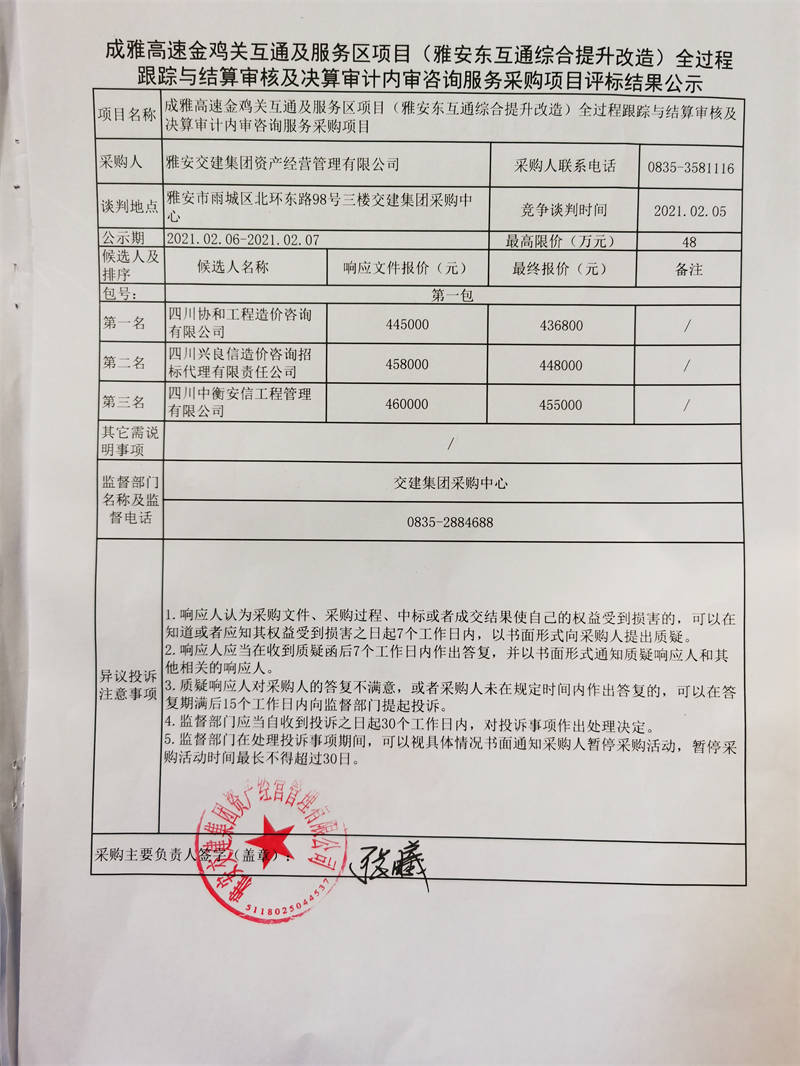 雅安交建集團(tuán)資產(chǎn)經(jīng)營管理有限公司成雅高速金雞關(guān)互通及服務(wù)區(qū)項(xiàng)目(雅安東互通綜合提升改造)全過程跟蹤與結(jié)算審核及決算審計(jì)內(nèi)審咨詢服務(wù)評標(biāo)結(jié)果公示