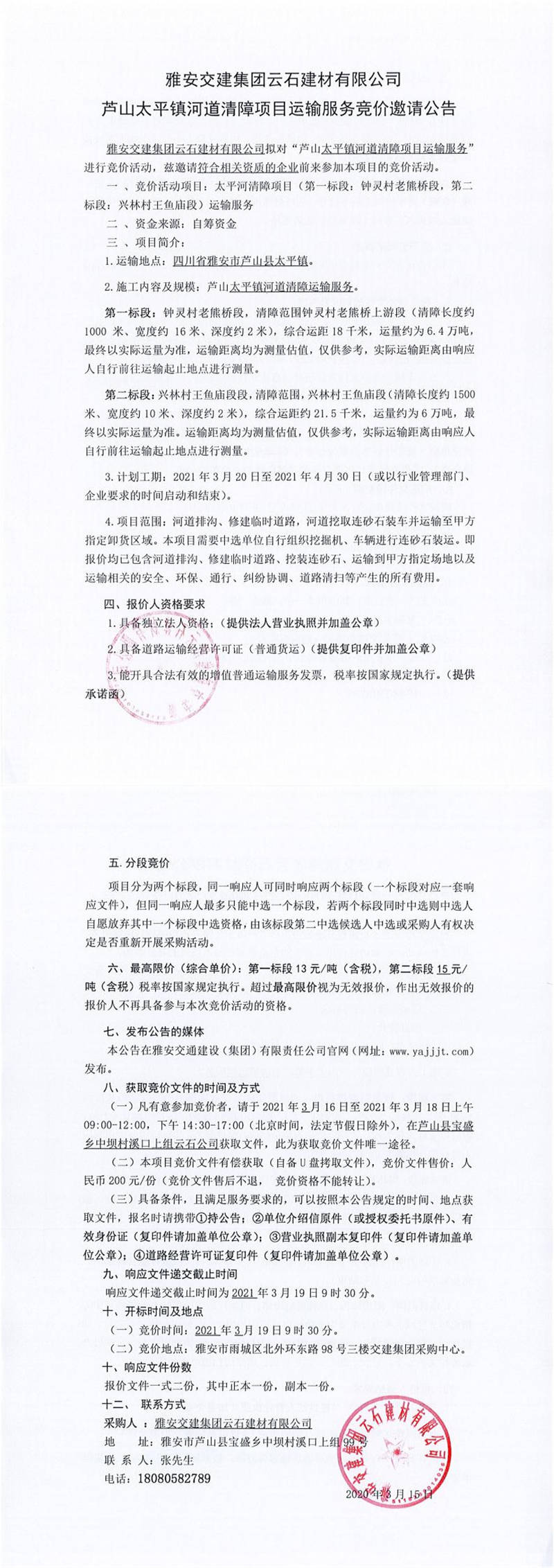 雅安交建集團(tuán)云石建材有限公司蘆山太平鎮(zhèn)河道清障項(xiàng)目運(yùn)輸服務(wù)競價(jià)邀請公告