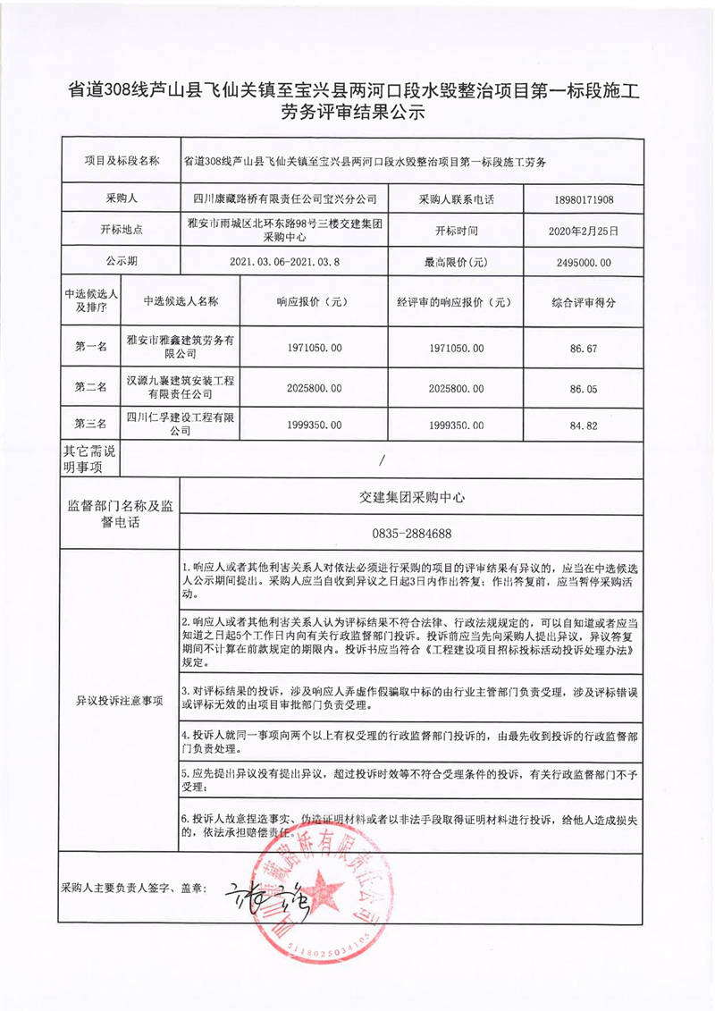 四川康藏路橋有限責任公司寶興分公司省道308線蘆山縣飛仙關(guān)鎮(zhèn)至寶興縣兩河口段水毀整治項目第一標段施工勞務(wù)評審結(jié)果公示