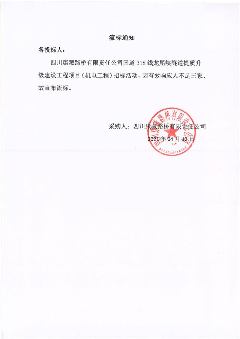 四川康藏路橋有限責(zé)任公司國道318線龍尾峽隧道提質(zhì)升級(jí)建設(shè)工程項(xiàng)目(機(jī)電工程)流標(biāo)通知