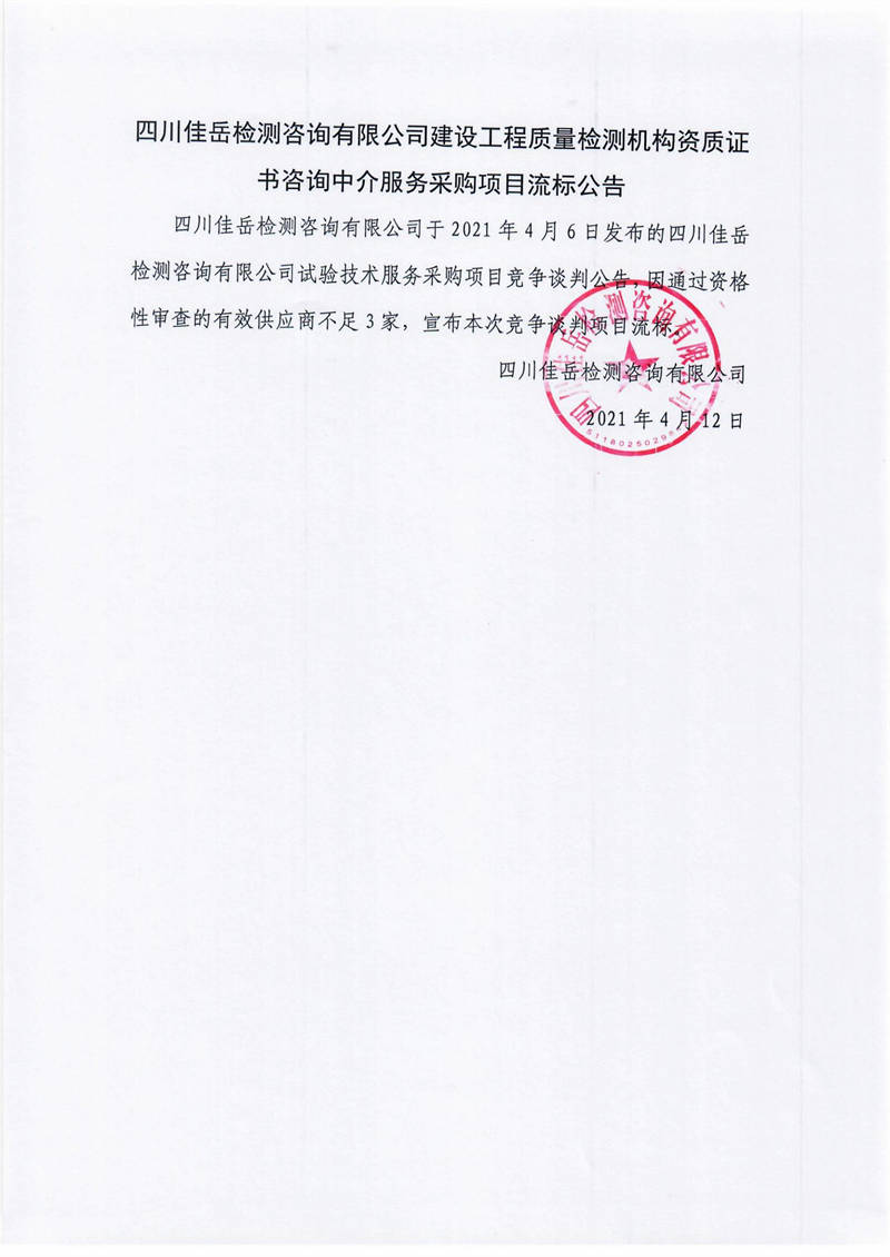 四川佳岳檢測咨詢有限公司建設工程質(zhì)量檢測機構(gòu)資質(zhì)證書咨詢中介服務采購項目流標公告