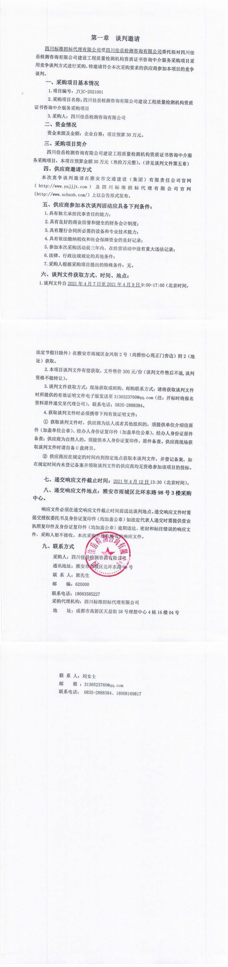 四川佳岳檢測咨詢有限公司建設工程質(zhì)量檢測機構資質(zhì)證書咨詢中介服務采購項目競爭談判公告