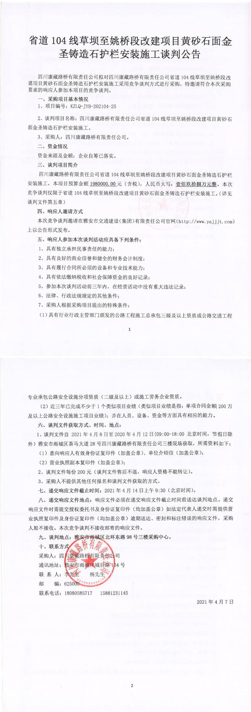 四川康藏路橋有限責(zé)任公司省道104線草壩至姚橋段改建項目黃砂石面金圣鑄造石護(hù)欄安裝施工談判公告