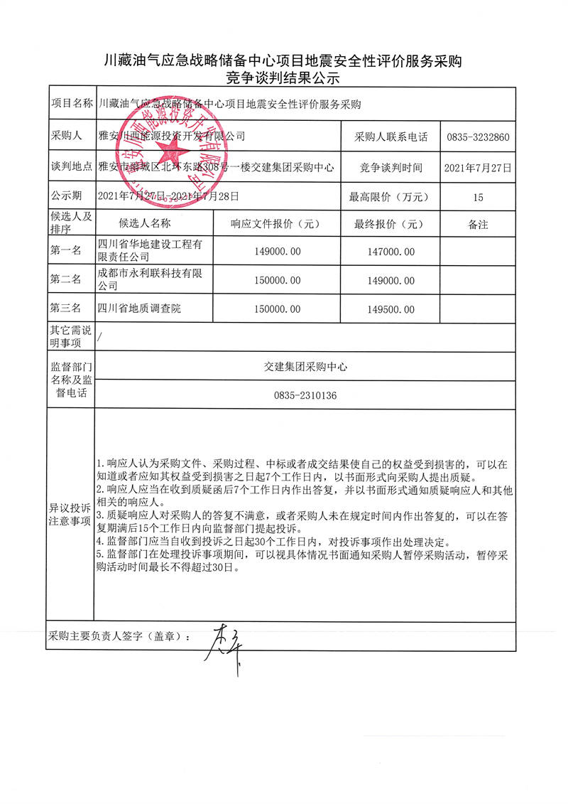 雅安川西能源投資開發(fā)有限公司川藏油氣應(yīng)急戰(zhàn)略儲備中心項(xiàng)目地震安全性評價服務(wù)采購競爭談判結(jié)果公示