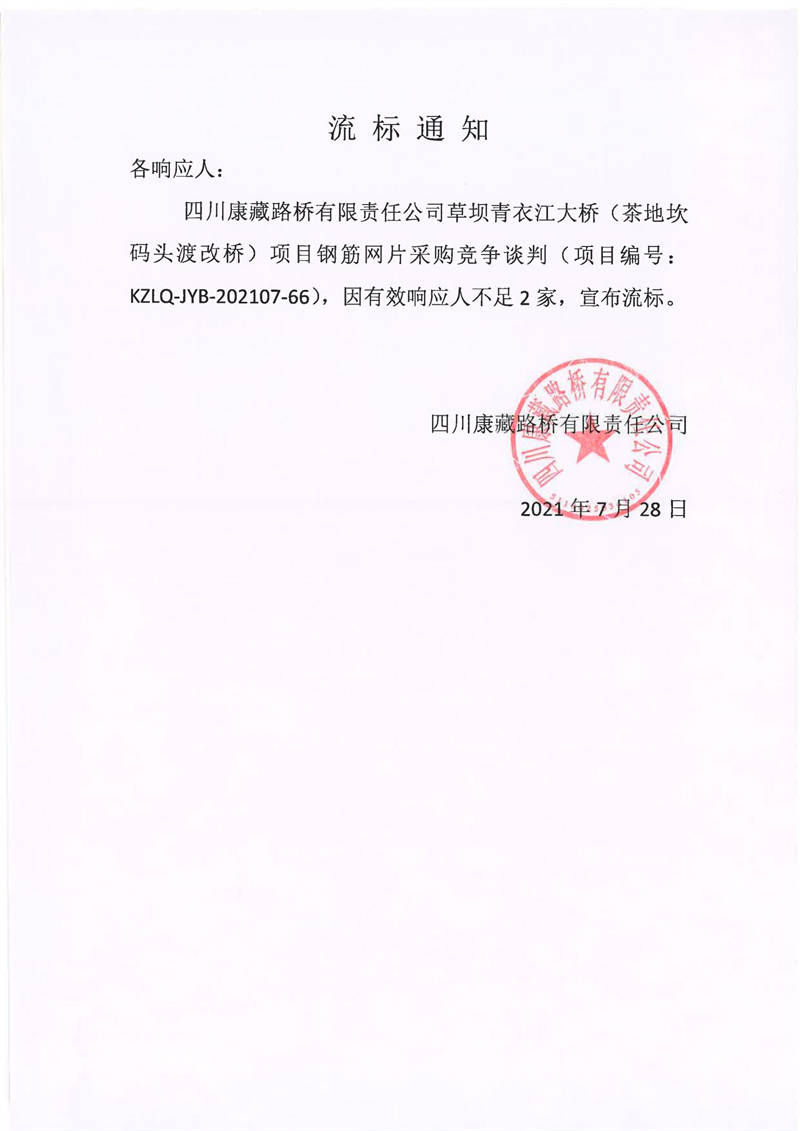 四川康藏路橋有限責(zé)任公司草壩青衣江大橋(茶地坎碼頭渡改橋)項目鋼筋網(wǎng)片采購競爭談判流標(biāo)通知