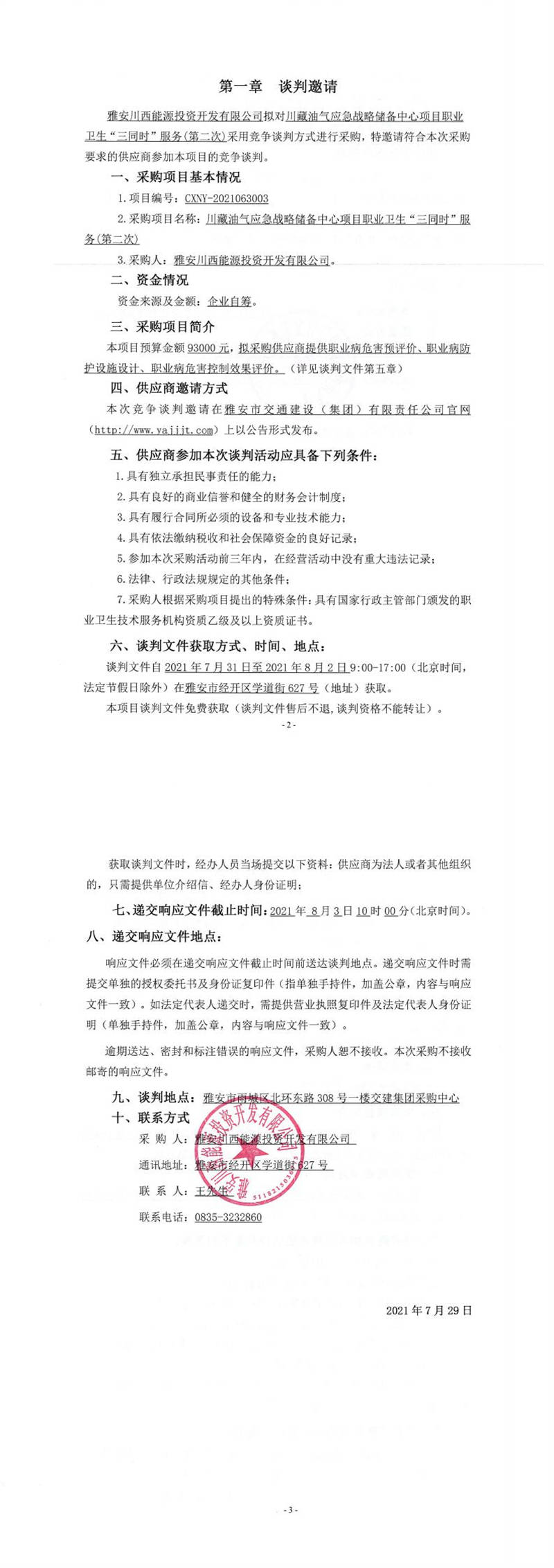 雅安川西能源投資開發(fā)有限公司川藏油氣應(yīng)急戰(zhàn)略儲備中心項(xiàng)目職業(yè)衛(wèi)生“三同時”服務(wù)(第二次)競爭談判公告