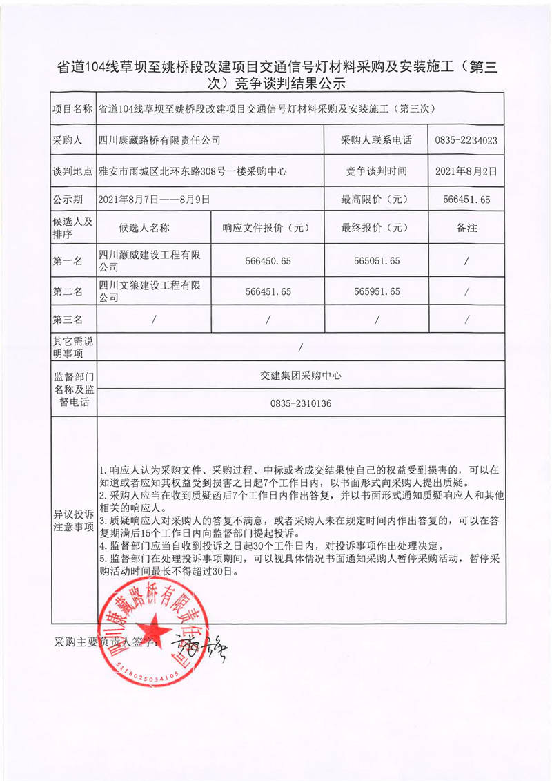 四川康藏路橋有限責任公司省道104線草壩至姚橋改建項目交通信號燈材料采購及安裝施工(第三次)競爭談判結果公示