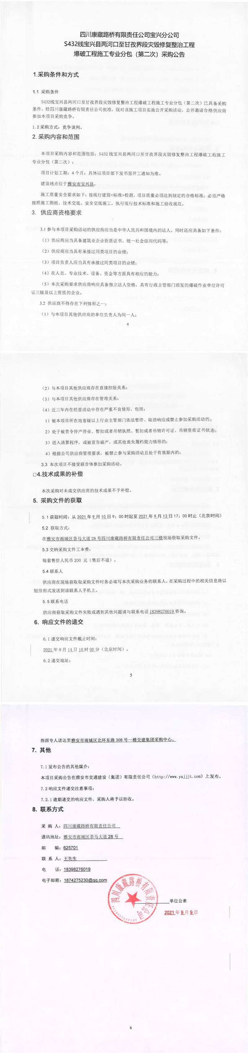 四川康藏路橋有限責(zé)任公司S432線(xiàn)寶興縣兩河口至甘孜界段災(zāi)毀修復(fù)整治工程爆破工程施工專(zhuān)業(yè)分包(第二次)采購(gòu)公告
