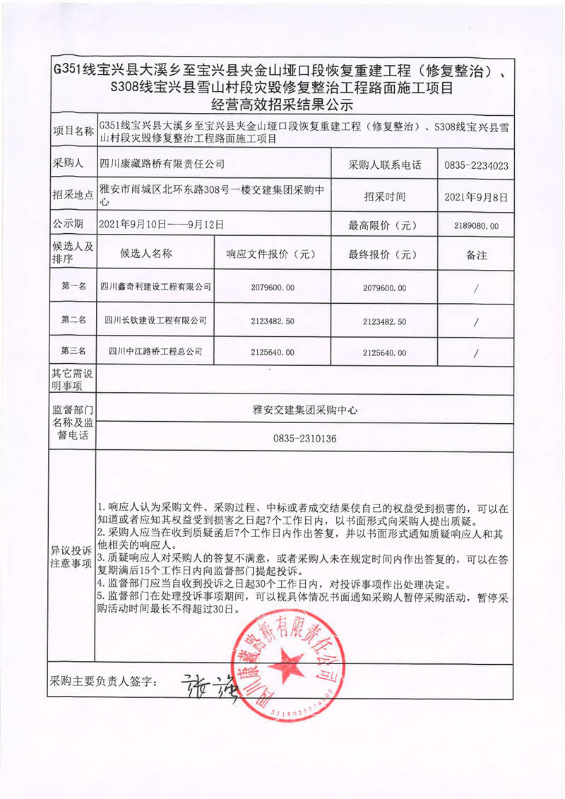 四川康藏路橋有限責任公司G351線寶興縣大溪鄉(xiāng)至寶興縣夾金山啞口段恢復重建工程(修復整治)、S308線寶興縣雪山村段災毀修復整治工程路面施工項目經營高效招采結果公示
