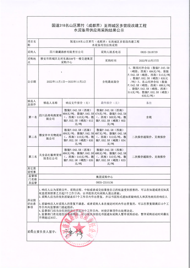 四川康藏路橋有限責(zé)任公司國(guó)道318名山區(qū)黑竹(成都界)至雨城區(qū)多營(yíng)段改建工程水泥備用供應(yīng)商采購(gòu)結(jié)果公示