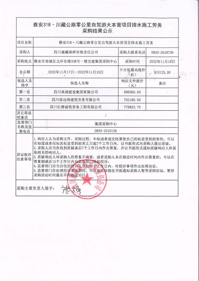 四川康藏路橋有限責(zé)任公司雅安318·川藏公路零公里自駕游大本營(yíng)項(xiàng)目排水施工勞務(wù)采購結(jié)果公示