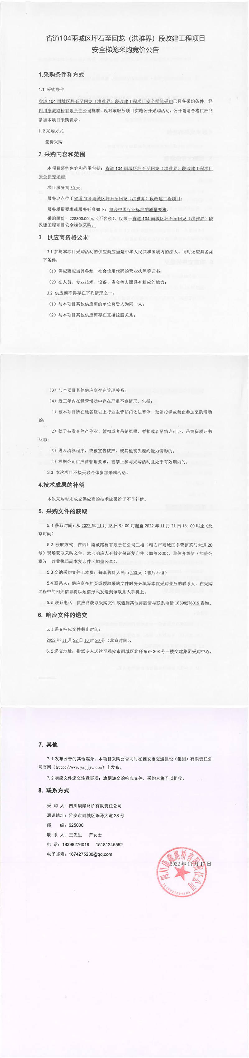 四川康藏路橋有限責(zé)任公司省道104雨城區(qū)坪石至回龍(洪雅界)段改建工程項(xiàng)目安全梯籠采購(gòu)競(jìng)價(jià)公告