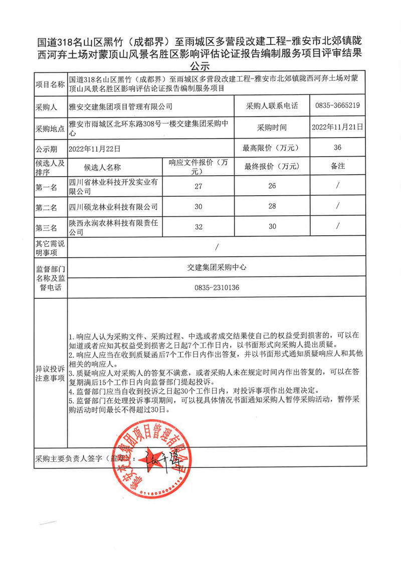 雅安交建集團項目管理有限公司國道318名山區(qū)黑竹(成都界)至雨城區(qū)多營段改建工程-雅安市北郊鎮(zhèn)隴西河棄土場對蒙頂山風(fēng)景名勝區(qū)影響評估論證報告編制服務(wù)評審結(jié)果公示