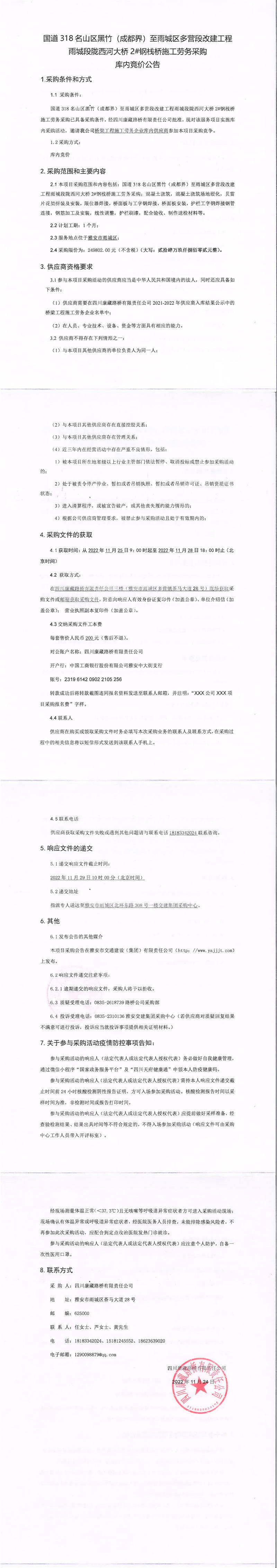 四川康藏路橋有限責(zé)任公司國道318名山區(qū)黑竹(成都界)至雨城區(qū)多營段改建工程雨城段隴西河大橋2#鋼棧橋施工勞務(wù)采購庫內(nèi)競價公告