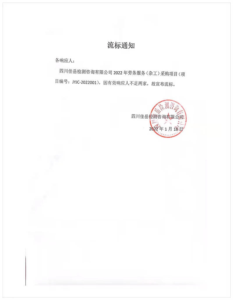 四川佳岳檢測咨詢有限公司2022年勞務(wù)服務(wù)(雜工)采購項目流標(biāo)通知