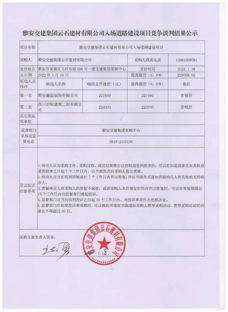 雅安交建集團云石建材有限公司入場道路建設(shè)項目競爭談判結(jié)果公示