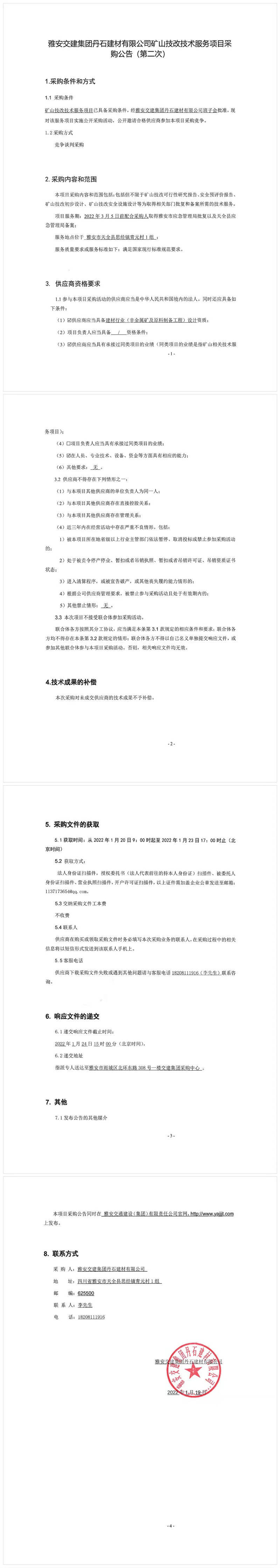 雅安交建集團丹石建材有限公司礦山技改技術(shù)服務(wù)項目采購公告(第二次)