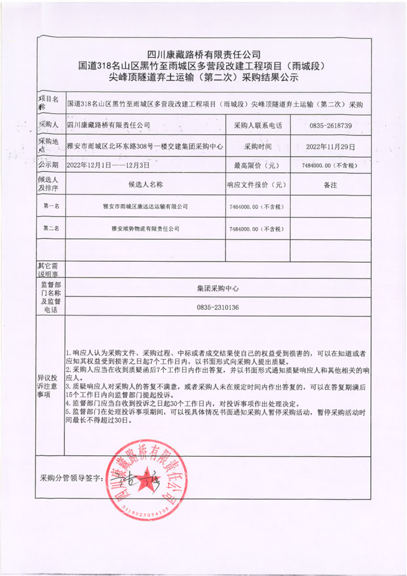 四川康藏路橋有限責(zé)任公司國道318名山區(qū)黑竹至雨城區(qū)多營段改建工程項目(雨城段)尖峰頂隧道棄土運輸(第二次)采購結(jié)果公示