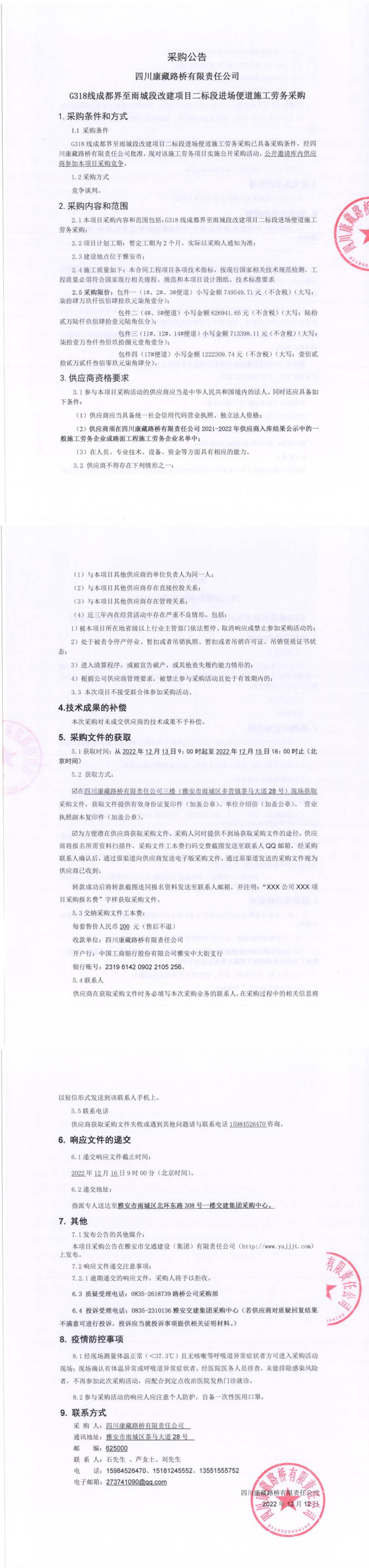 四川康藏路橋有限責(zé)任公司G318線成都界至雨城段新改建項目二標段進場便道施工勞務(wù)采購公告