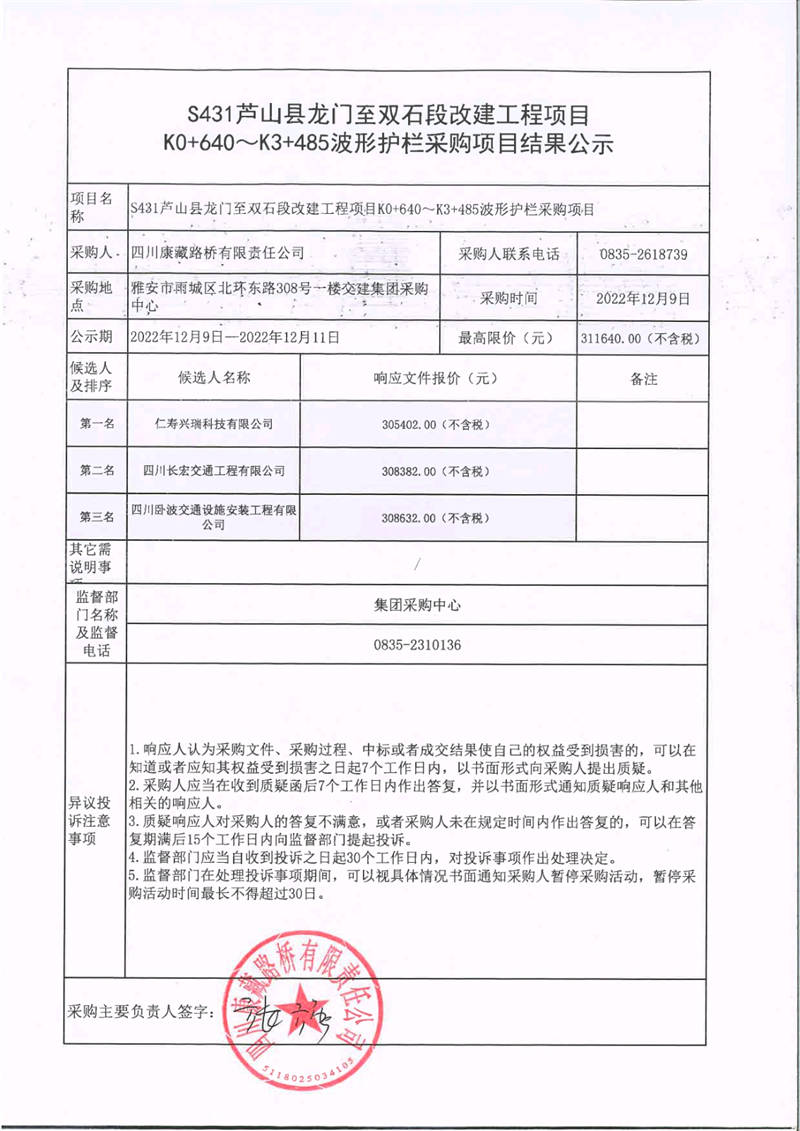 四川康藏路橋有限責(zé)任公司S431蘆山縣龍門至雙石段改建工程項目K0+640~K3+485波形護(hù)欄采購項目結(jié)果公示
