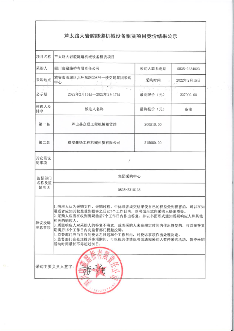 四川康藏路橋有限責(zé)任公司蘆太路大巖腔隧道機(jī)械設(shè)備租賃項(xiàng)目競價(jià)結(jié)果公示