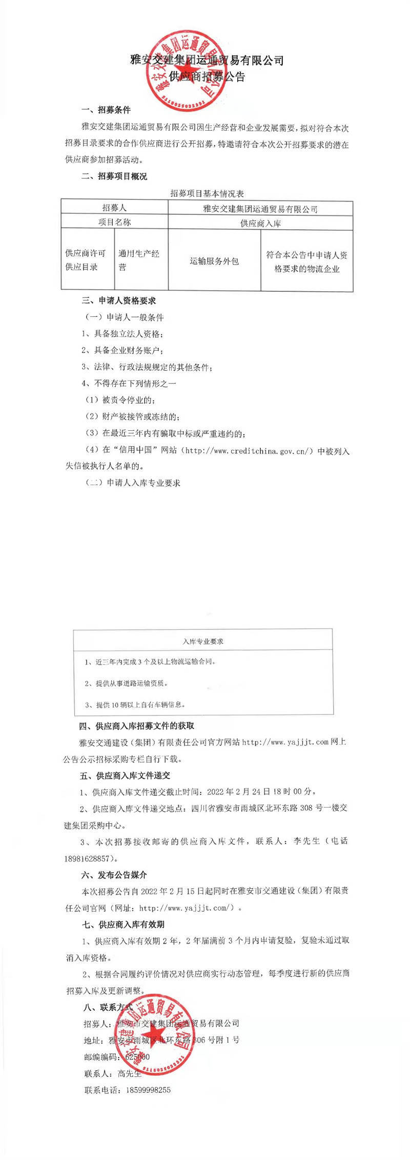 雅安交建集團運通貿(mào)易有限公司供應(yīng)商招募公告