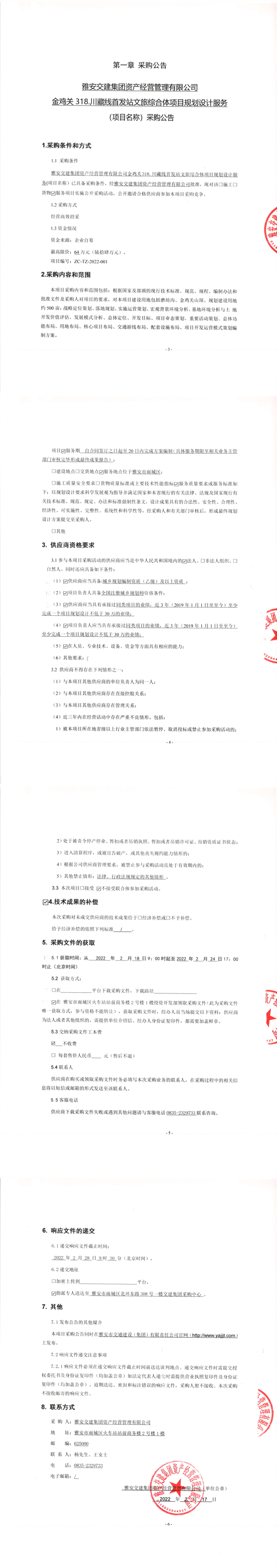雅安交建集團(tuán)資產(chǎn)經(jīng)營(yíng)管理有限公司金雞關(guān)318.川藏線首發(fā)站文旅綜合體項(xiàng)目規(guī)劃設(shè)計(jì)服務(wù)采購(gòu)公告
