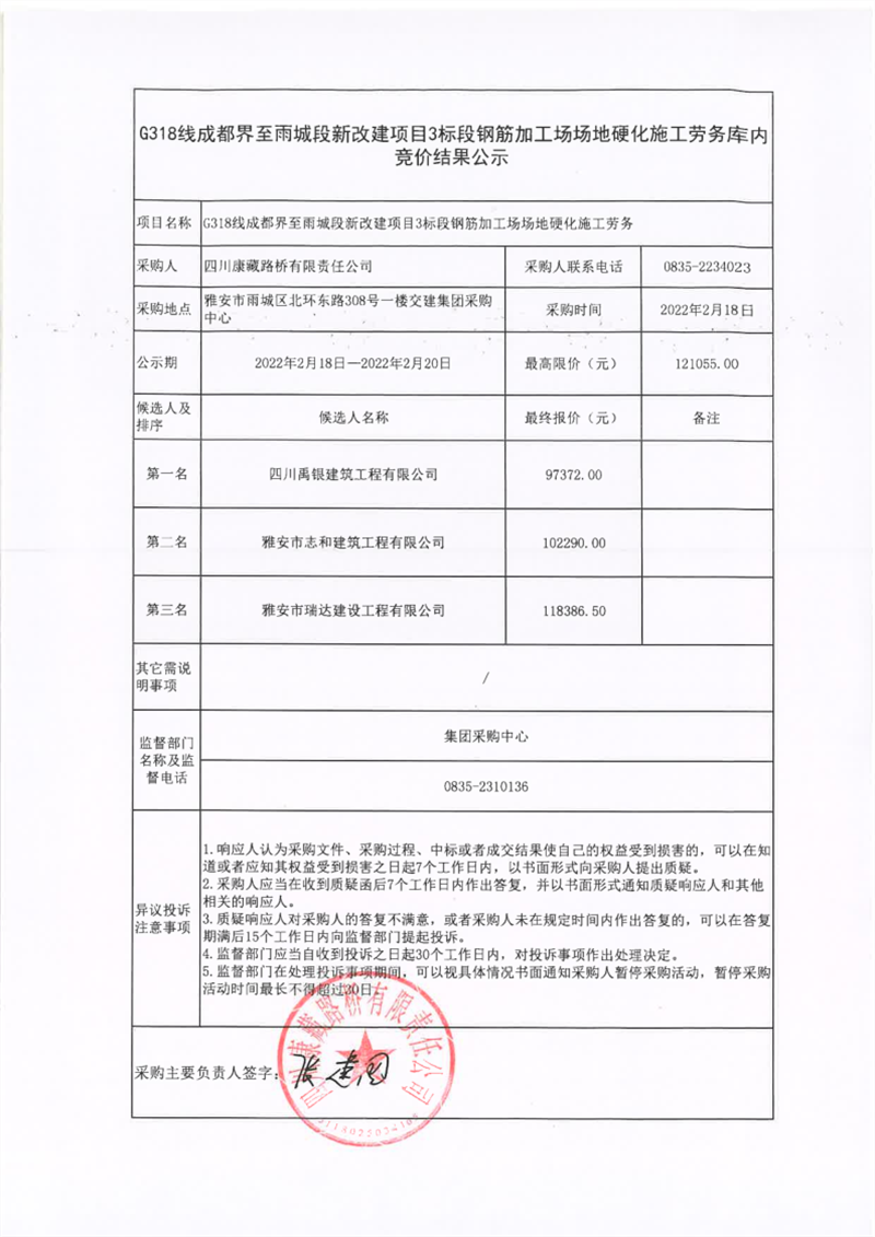 四川康藏路橋有限責(zé)任公司G318線成都界至雨城段新改建項目3標(biāo)段鋼筋加工場場地硬化施工勞務(wù)庫內(nèi)競價結(jié)果公示