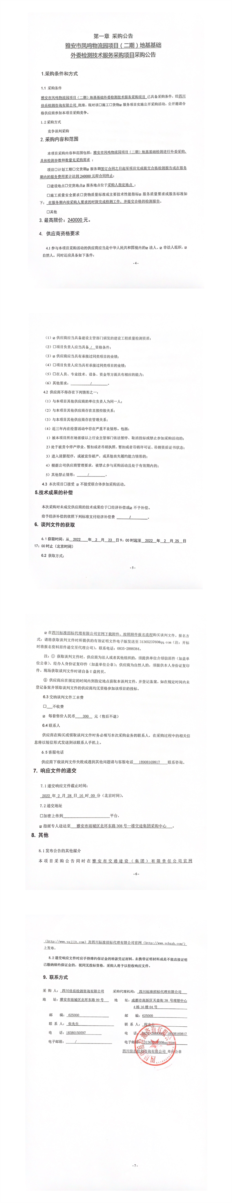 四川佳岳檢測咨詢有限公司雅安市鳳鳴物流園項目(二期)地基基礎外委檢測技術服務采購項目采購公告