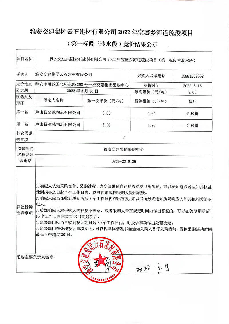 雅安交建集團(tuán)云石建材有限公司2022年寶盛鄉(xiāng)河道疏浚項(xiàng)目(第一標(biāo)段三渡水段)競(jìng)價(jià)結(jié)果公示