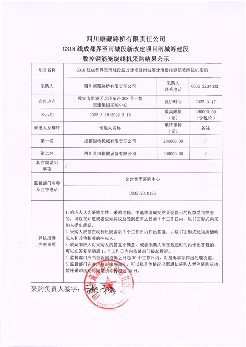四川康藏路橋有限責(zé)任公司G318線(xiàn)成都界至雨城段新改建項(xiàng)目雨城籌建段數(shù)控鋼筋籠繞線(xiàn)機(jī)采購(gòu)結(jié)果公示