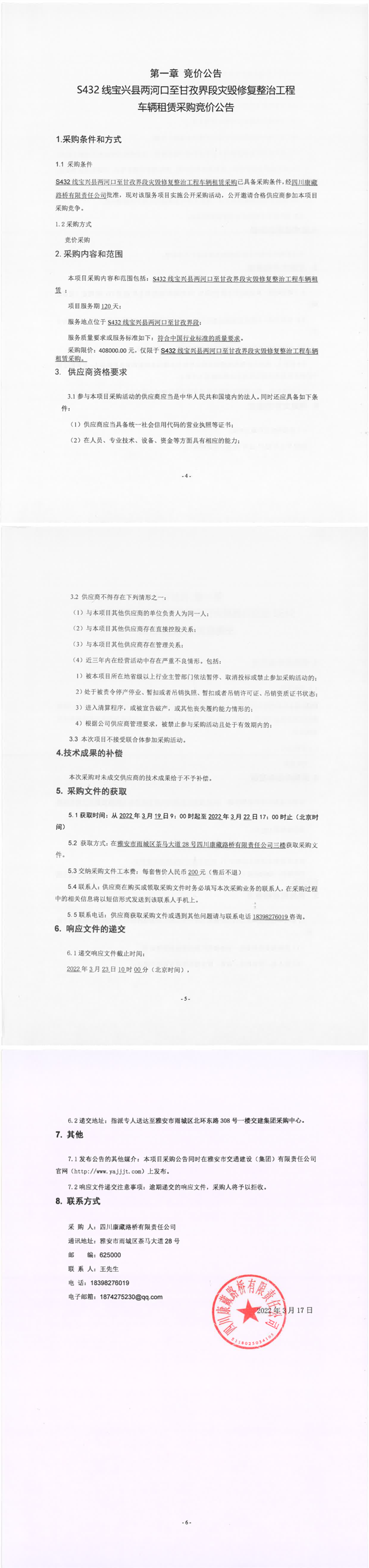 四川康藏路橋有限責任公司S432線寶興縣兩河口至甘孜界段災(zāi)毀修復(fù)整治工程車輛租賃采購競價公告
