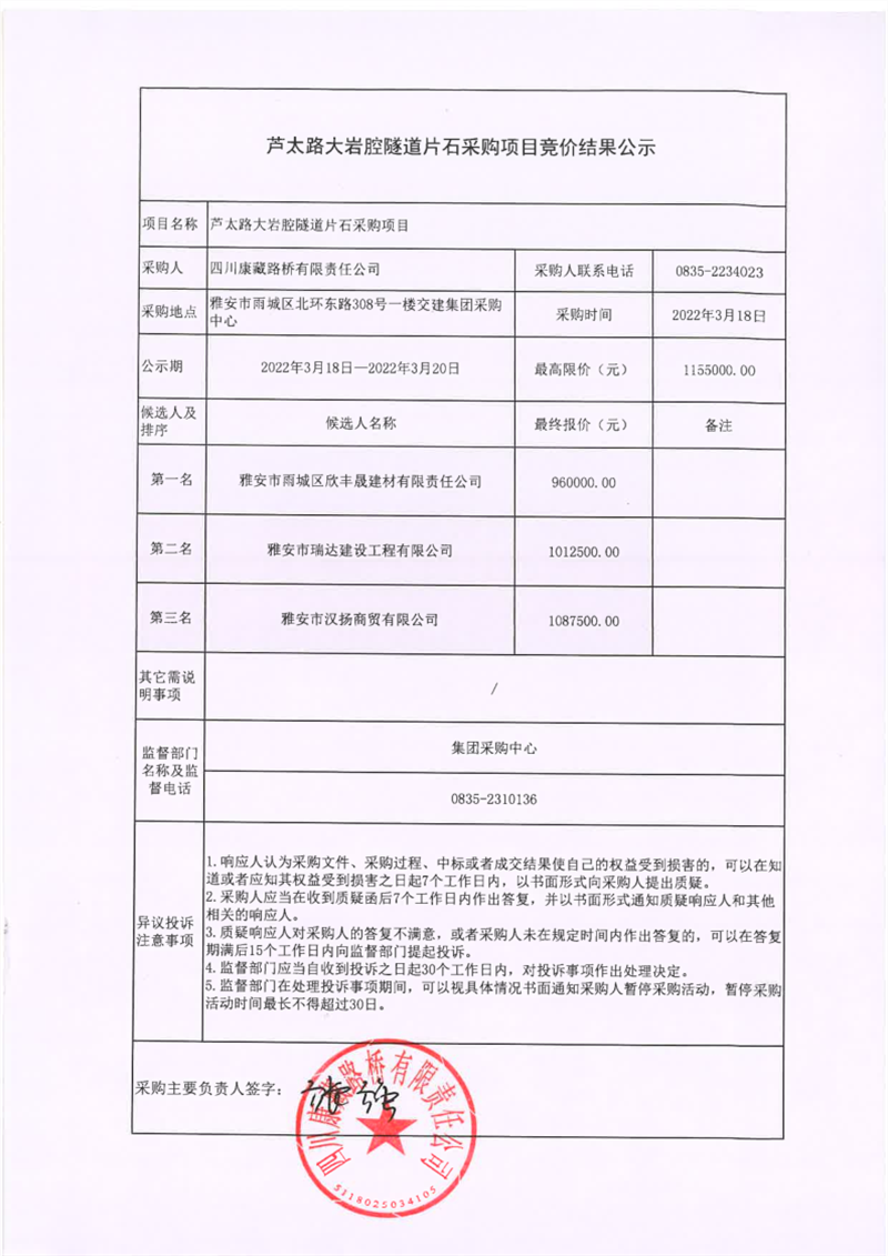 四川康藏路橋有限責(zé)任公司蘆太路大巖腔隧道片石采購項(xiàng)目競價(jià)結(jié)果公示
