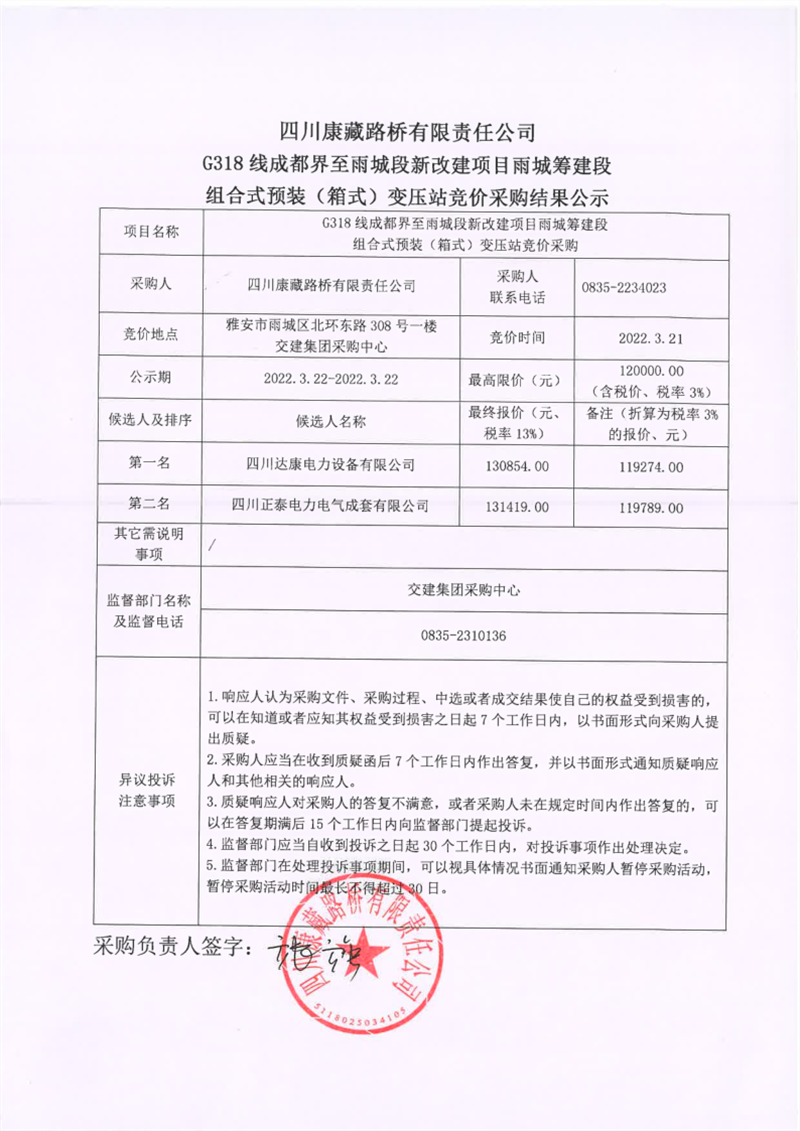 四川康藏路橋有限責任公司G318線成都界至雨城段新改建項目雨城籌建段組合式預裝(箱式)變壓站競價采購結(jié)果公示
