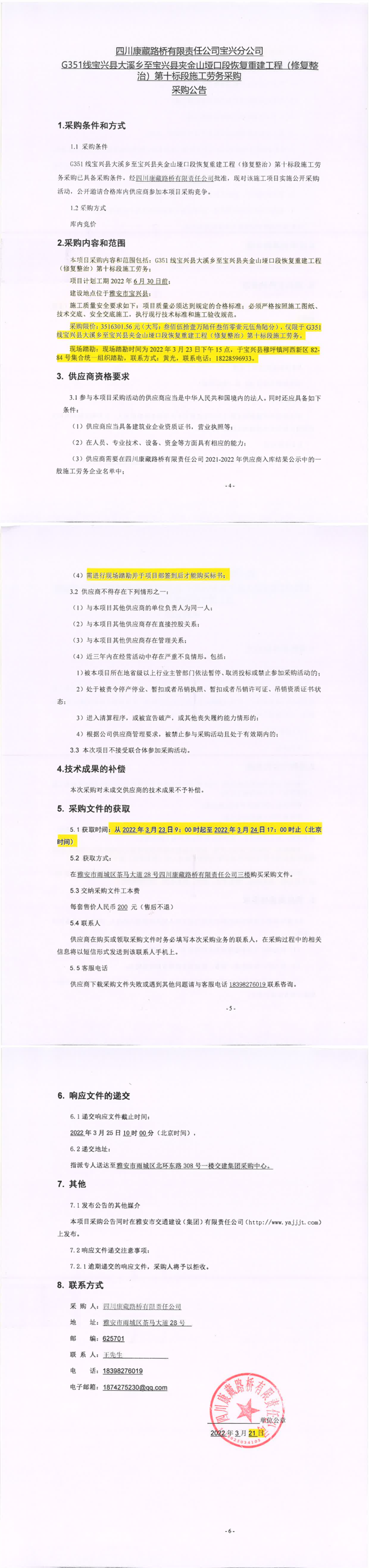 四川康藏路橋有限責(zé)任公司寶興分公司G351線寶興縣大溪鄉(xiāng)至寶興縣夾金山埡口段恢復(fù)重建工程(修復(fù)整治)第十標(biāo)段施工勞務(wù)采購采購公告