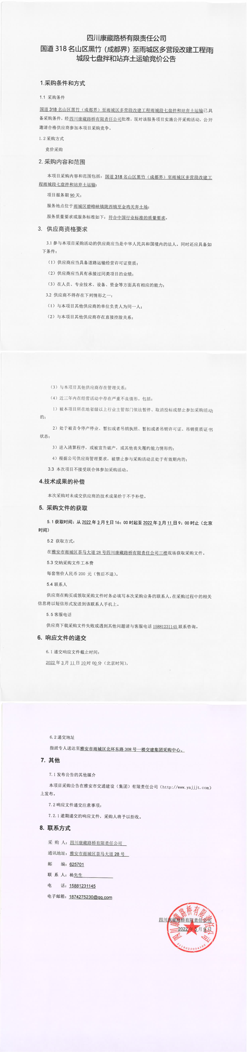 四川康藏路橋有限責(zé)任公司國道318名山區(qū)黑竹(成都界)至雨城區(qū)多營段改建工程雨城段七盤拌和站棄土運輸競價公告