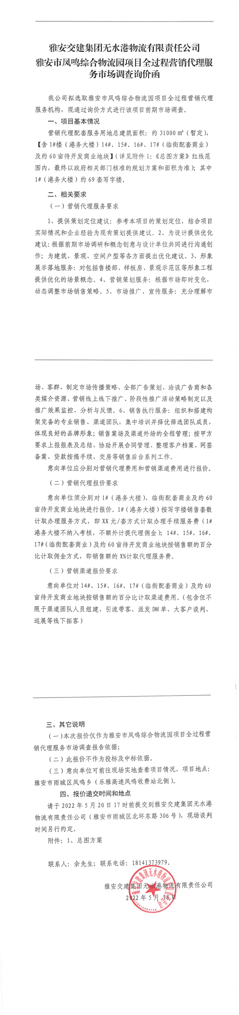 雅安交建集團(tuán)無水港物流有限責(zé)任公司雅安市鳳鳴綜合物流園項(xiàng)目全過程營銷代理服務(wù)市場調(diào)查詢價(jià)函