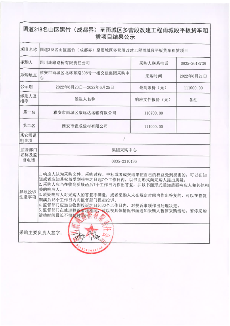 四川康藏路橋有限責任公司國道318名山區(qū)黑竹(成都界)至雨城區(qū)多營段改建工程雨城段平板貨車租賃項目結果公示