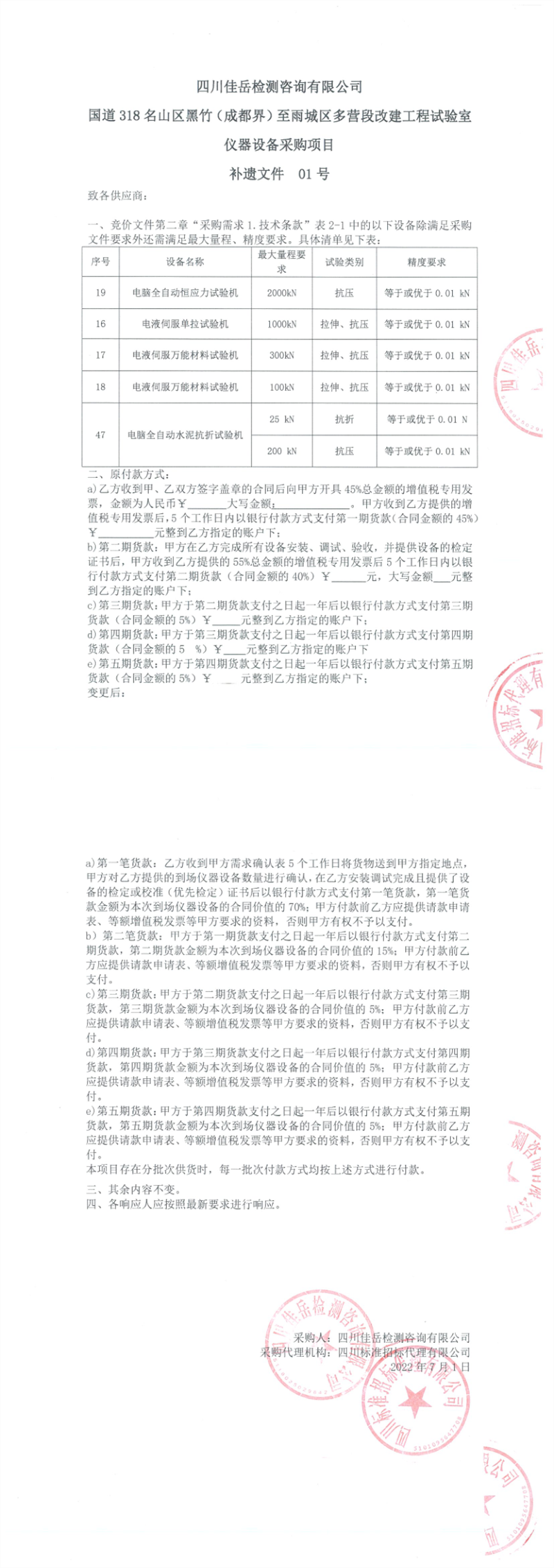 四川佳岳檢測咨詢有限公司國道318名山區(qū)黑竹(成都界)至雨城區(qū)多營段改建工程試驗室儀器設(shè)備采購項目補遺文件01號